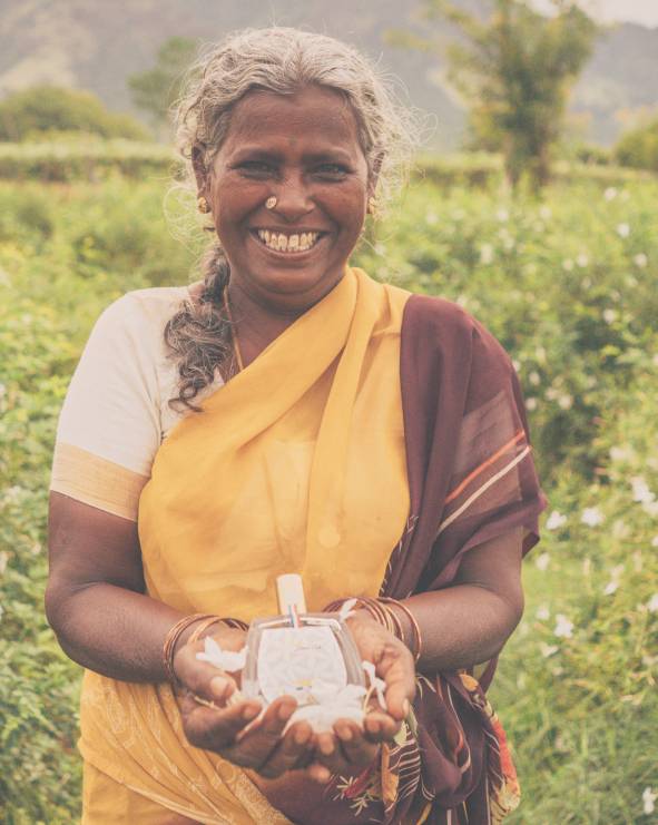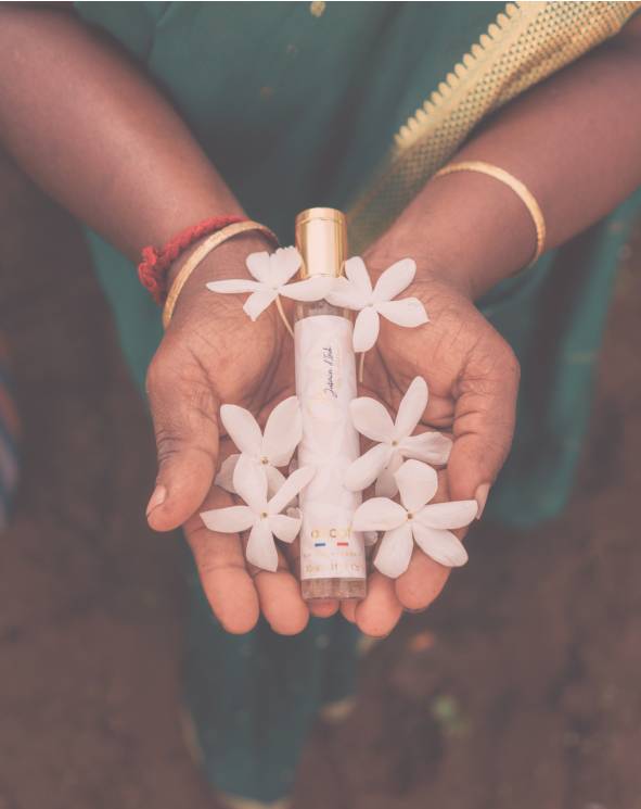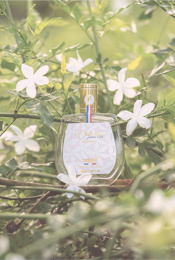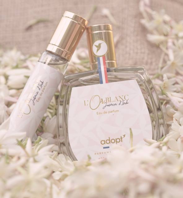« A travers l’Or Blanc j’ai voulu rendre hommage au Jasmin d’Inde, cette fleur précieuse à l’odeur exceptionnelle. J’ai souhaité composer un bouquet floral, lumineux et éclatant mais aussi tendre et enveloppant grâce à la fleur d’amandier et aux muscs blancs »